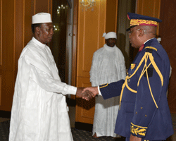 La traditionnelle cérémonie de vœux au Chef de l’État a commencé à 10H 40 minutes avec les membres du conseil supérieur des affaires islamiques dirigés par l’imam Cheikh Hissein Hassan Abacar. L’occasion était tout indiquée pour les oulémas de souhaiter au Président de la République, à tous ses proches collaborateurs, au gouvernement et au peuple tchadien, les vœux de bonheur, de paix et de santé. L’imam Cheikh Hassan Hissein Abacar a salué les efforts fournis par le Chef de l’État IDRISS DEBY ITNO dans la consolidation de la paix, l’unité nationale et la sécurité retrouvée. Sur le plan politique, le président du conseil supérieur des affaires islamiques s’est réjoui de la mise en place du cadre national de dialogue politique permanent qui selon lui, constitue un mécanisme susceptible de diriger le pays, dans la constante politique. Il a demandé aux principaux acteurs politiques de cultiver l’amour et la coexistence entre les religions. Cheikh Hissein hassan Abacar a imploré Dieu, le créateur du monde et le Tout-Puissant, de guider les pas du Chef de l’État IDRISS DEBY ITNO et de l’aider à parachever la marche du Tchad vers le progrès et le développement combien bénéfique pour le peuple tchadien et pour les futures générations. Deuxième temps fort de cette présentation des vœux : Le Président IDRISS DEBY ITNO a reçu ensuite les vœux des différents corps constitués qui ont tenu à lui témoigner leur gratitude dans sa noble et exaltante mission. A noter qu’au cours de la cérémonie, le Chef de l’État était entouré du Premier ministre Joseph Djimrangar Dadnadji, de son Directeur du Cabinet civil Kalzeubé Pahimi Deubet et du Secrétaire général de la Présidence Bédoumra Kordjié.Le tout s’est déroulé sous une bonne pluie fine.
