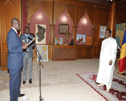 Il est dix heures ce vendredi 09 novembre 2012, la mise en place est terminée dans la salle déaudience de la Présidence de la République. Le Protocole déÉtat annonce léentrée du Président de la République, chef de léÉtat, Chef suprême des armées. Le Chef déÉtat-major général des armées, le général de division Yambaye Massira Abel ordonne le salut au Chef suprême des armées. IDRISS DEBY ITNO leur ordonne de se mettre à léaise. Ordre exécuté. Céest dans ce décor que commence la cérémonie de solidarité et de fidélité au Chef suprême des armées avec léallocution du ministre délégué auprès de la Présidence de la République, chargé de la Défense nationale et des anciens combattants, M. Bénaïdo Tatola. Après cette allocution, la quarantaine déofficiers généraux et supérieurs de léÉtat-major général des armées et les commandants des grandes formations a tenu à exprimer au Président de la République, Chef de léÉtat, Chef suprême des armées, son indéfectible fidélité et honneur de servir la patrie. Debout, le Chef de léÉtat a serré les mains de chacun déeux en répondant à leurs véux en ces termes je cite : « Merci, beaucoup », fin de citation.