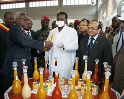 Cette unité industrielle, fruit de la coopération entre le Tchad et le Gouvernement indien à travers le projet Team 9 est la concrétisation déun contrat pour la réalisation de quatre usines au Tchad. Le coût de construction de léusine séélève à 1milliard 113 millions de francs CFA. Léacquisition et léinstallation du matériel séélèvent à 520 millions de francs CFA .La Société de jus de fruit de Doba mettra sur le marché, du jus de valeur nutritive et de bonne qualité renfermant les éléments vitaux et naturels. Selon le Directeur Général de cette société Saad Chérif Ahmed, léapprovisionnement de cette usine en matière première se fera à travers un réseau qui sera étendu sur léensemble du pays grâce au renforcement des capacités des producteurs par léacquisition des unités mobiles déextraction des jus. «Les populations tireront profit de ce judicieux investissement comme le cas du pétrole qui a permis au Tchad de développer ses grandes ambitions et séinscrire sur la liste des pays émergents» a déclaré le Gouverneur du Logone Oriental Mahamat Zène Alhadj Yaya. Le ministre du Commerce et de léIndustrie Youssouf Abassallah a relevé pour sa part que léinauguration de cette usine est le couronnement déune longue épopée de la filière agro-industrie dont les effets multiplicateurs sur lééconomie sont nombreux et variés. Youssouf Abassallah a demandé aux responsables de cette unité industrielle de travailler pour léexcellence et la qualité car dans ce secteur de grande consommation, il néya pas de place ni à léerreur ni à la négligence. Après avoir coupé le ruban, le Président de la République IDRISS DEBY ITNO a eu droit à une visite guidée de cette unité de production industrielle. «Cette cérémonie a un grand sens pour le pays», a souligné le Chef de léÉtat IDRISS DEBY ITNO qui a demandé aux producteurs de se mettre résolument au travail pour alimenter de matière première, 365 jours sur 365, léusine de jus de fruit de Doba .La République de léInde par la voix de son ambassadeur au Tchad séengage à multiplier ses investissements au Tchad pour les trois prochaines années.