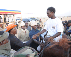 En marge des manifestations de la fête nationale de la transhumance, le couple présidentiel a honoré de sa présence à la parade des chevaux et chameaux organisée à son intention dans la matinée du 18 Novembre 2012 à léhippodrome de Ouadi Djedid. Cette parade a vu la participation de quelque 3000 cavaliers et chameliers de la région du Batha et des délégations venues des régions du Borkou,de léEnnedi Est et Ouest. Léoccasion était tout indiquée pour le Président de la République IDRISS DEBY ITNO et la Première Dame HINDA DEBY ITNO déapprécier les différentes races et types de chevaux et chameaux des régions précitées et les richesses culturelles du pays de Toumai. Dans léaprès-midi, le couple présidentiel a assisté à trois courses de chevaux et à deux courses de chameaux. Il séagit du « GRAND PRIX FENAT 2012 »placé sous le haut patronage du Chef de léÉtat organisé grâce à léassistance technique de léAssociation déEncouragement pour léamélioration des races des chevaux au Tchad (AEARCT).Toutes ces courses sont dotées de meilleurs prix allant de 100.000FCFA à 2.000.OOO de Francs CFA. La première course de chevaux est courue sur une distance de 1500mètres avec 17 chevaux partant. La deuxième course a regroupé 20 chevaux sur une distance de 1600 mètres et la troisième course des chevaux courue sur 1800mètres. La première course des dromadaires a vu le départ de 70 chameaux et la deuxième, la participation de 72 dromadaires qui ont couru sur une distance de 5000 mètres soit 5kilomètres. A léissue de ces courses, des prix de réconfort ont été décernés par le Chef de léÉtat IDRISS DEBY ITNO à la Télévision panafricaine AFRICA 24 et à léOffice national de Radio et Télévision (ONRTV) pour la bonne couverture médiatique de léévènement.