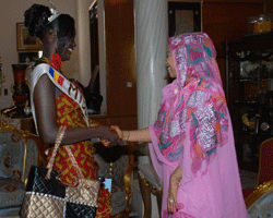 Démarche scintillante, beauté naturelle, filiforme, Mlle Djivira Sakadi, 1m 78 pour 60 kg incarne le top de la beauté Tchadienne depuis le 28 décembre 2013. Elle a franchi, ce jeudi, pour la première fois le portail du palais présidentiel à l’effet de s’entretenir avec la marraine du concours de beauté au Tchad, la Première Dame HINDA DEBY ITNO. L’icône de la beauté tchadienne 2014 est accompagnée de son manager, Dr Allah-Ridy Koné, actuel président du Conseil d’administration de l’Université Emi-Koussi. L’entretien entre celle qui parraine tous les ans l’élection Miss-Tchad et qui veut, à travers cette manifestation culturelle, valoriser la beauté physique et intellectuelle de la femme tchadienne, j’ai nommé la Première Dame et l’ambassadrice de la beauté tchadienne 2014, a duré plus de trois quart heures. Agée de 20 ans, étudiante en 2ème année de Droit à l’Université de N’Djaména, Miss-Tchad 2014, a décliné, au cours de l’audience son projet à la Première Dame HINDA DEBY ITNO, un projet, qui selon Mlle Djivira Sakadi, a recueilli l’assentiment de sa Marraine. Fiers et honorés d’être reçus par la Première Dame, la souche de la beauté tchadienne 2014 et son manager ont quitté le palais présidentiel avec une abondante moisson de souvenirs et de soutien découlant des échanges avec la Première Dame du Tchad.