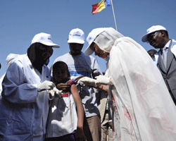 Après le Niger, le Burkina-Faso et le Mali, le Tchad bénéficie aujourdéhui de léintroduction du vaccin contre la méningite de souche « A » (MENAFRIVAC). Cette vaste opération lancée ce 11 décembre par le Président de la République IDRISS DEBY ITNO, qui avait à ses côtés la Première Dame HINDA DEBY ITNO touchera plus de huit millions de Tchadiens. Elle séétalera en quatre phases. La phase lancée ce matin concerne trois régions à savoir : la ville de Né Djaména, la région du Chari-Baguirmi et le Mayo-Kebbi Est. Dans son mot de bienvenue, le gouverneur de la région de NéDjaména, M. Hassane Saline, a salué la présence du couple présidentiel, qui, selon lui, est un facteur déterminant pour la réussite de ladite campagne. Le Directeur régional de léUNICEF pour léAfrique de léOuest et du Centre et le représentant de léOMS au Tchad ont tous salué, léimplication personnelle du Président de la République contre les maladies invalidantes. Ils ont en outre, réaffirmé léengagement de leurs institutions respectives à soutenir le Tchad dans sa quête déune santé pour tous. Lançant officiellement la campagne, le ministre de la Santé publique, Dr Toupta Boguéna a souligné que la méningite sévit de manière récurrente au Tchad. Selon elle, en 2010 léon a enregistré 3.200 cas dont 268 décès. Séadressant au couple présidentiel, Dr Toupta Boguéna, a déclaré: « vous avez fait votre part de travail, en mettant à notre disposition les fonds nécessaires pour cette campagne, la balle est maintenant dans notre camp ». Le ministre de la Santé devait par la suite demander à léensemble du personnel médical de séimpliquer pour que la campagne soit une réussite totale. Après avoir administré quelques gouttes de vaccin suivi par la Première Dame et le Premier ministre, le Chef de léÉtat IDRISS DEBY ITNO a demandé à tous ses compatriotes âgés de 1 à 29 ans de se faire vacciner massivement. « Le nouveau vaccin est sûr, sans danger, gratuit et protège pendant 10 ans ». Le Président de la République a ensuite demandé aux forces de défense et de sécurité de séimpliquer dans cette campagne de vaccination en mettant leurs véhicules à la disposition des agents vaccinateurs. Il a demandé enfin aux journalistes de tous bords de sensibiliser la masse pour le succès de ladite campagne et celle à venir.