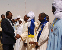 Le Chef de lÉtat a été accueilli à sa descente davion à laéroport international de Faya-Largeau par le gouverneur de la région de Borkou Youssouf Sougoudy. Après le rituel daccueil, le Chef de lÉtat IDRISS DEBY ITNO, Chef suprême des armées a passé les troupes en revue. Il sagit dun détachement de la gendarmerie nationale, de linfanterie militaire et de la garde nationale et nomade du Tchad (GNNT) basés à Faya. Le Président IDRISS DEBY ITNO a salué ensuite, les officiers supérieurs de larmée tchadienne, une poignée dofficiers français des Eléments français au Tchad (EFT),détachement de Faya, les personnalités civiles, les chefs traditionnels, députés et cadres de la région de Borkou. Le Président de la République a pris un bain de foule à son arrivée à Faya sous lanimation des militants du Mouvement patriotique du salut et des différents groupes folkloriques. Comme lors de sa visite de travail à Abéché, le Chef de lÉtat IDRISS DEBY ITNO a rencontré, les principaux responsables administratifs, traditionnels, militaires et autres groupes socioprofessionnels de la région de Borkou.