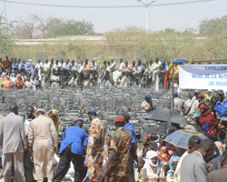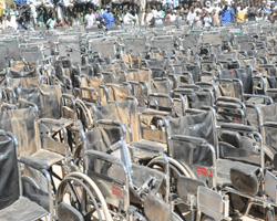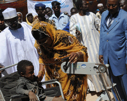Le ministre de léAction sociale, de la famille et de la solidarité nationale, Mme Fatimé Issa Ramadane, représentant la Première Dame HINDA DEBY ITNO a remis dimanche 05 février des tricycles, fauteuils roulants et béquilles aux handicapés moteurs déAbéché, chef-lieu de la région du Ouaddaï.