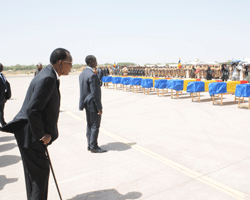 La nation tchadienne toute entière a rendu ce vendredi matin un hommage mérité aux militaires tchadiens tombés sur le champ déhonneur le vendredi 22 février dernier dans le massif de léAdrar des Ifoghas au Mali. Ils sont 26 martyrs dont les corps ont été rapatriés de Niamey ce 1er mars 2013. Céest à 9h 00 que la cérémonie à débuté avec léarrivée du Président de la République IDRISS DEBY ITNO, habillé tout en noir. Visage accablé par la douleur, le Chef de léÉtat a tenu à rendre hommage à ces valeureux fils du pays qui ont payé de leur vie pour mettre hors déétat de nuire les narcoterroristes qui ambitionnent de faire du Mali leur base arrière afin déétendre leurs tentacules sur les autres États du Sahel. A léaéroport de la base militaire Sergent Chef Adji Kosseï, tout léappareil gouvernemental conduit par le Premier ministre Joseph Djimrangar Dadnadji, le Président de léAssemblée nationale, Dr Haroun Kabadi, les députés, les hommes de Dieu (musulmans, protestants et catholiques) et bien déautres personnalités, notamment des diplomates étaient présents à la première phase de cette cérémonie funèbre. Il est à signaler également la présence des délégations étrangères venues du Niger, du Mali, du Burkina-Faso et de la délégation de la CEDEAO. Léavion C-130 de léarmée de léair tchadienne piloté par le Général Mahamat Rozi ayant à bord les 26 corps des martyrs atterrit sur le tarmac de léaéroport à 8h 55. A 9h, le Président de la République accompagné du Premier ministre et du ministre délégué à la Présidence de la République chargé de la défense nationale et des anciens combattants se rendent au bas de la passerelle pour accueillir les corps. Les cercueils montés sur des plateaux passent en revue la troupe. Léémotion était grande. Le moment est tout indiqué pour les témoignages. Le bal est ouvert par le ministre nigérien de la Communication et des nouvelles technologies de léinformation, M. Salifou Labo Bouché, représentant le Président Mohamadou Issoufou. Il a présenté les condoléances du gouvernement et du peuple nigérien au gouvernement tchadien et aux familles éplorées. « Mon pays a tenu, dans ces moments douloureux déêtre à vos côtés, pour rendre hommage aux 26 soldats tchadiens tombés dans léaccomplissement de leur devoir dans le septentrion malien », souligne le ministre nigérien, avant déajouter que le sacrifice de léarmée tchadienne doit être salué partout en Afrique, car elle a lutté pour la paix et la sécurité du Mali et de léAfrique. Léattaché de défense de léAmbassade de France au Tchad a salué, au nom de son pays, la mémoire des martyrs. « Ce 22 février 2013, le Tchad a payé un lourd tribut au combat mené par léensemble des forces africaines et européennes contre léordre terroriste au Sahel. Amie du Tchad, pleinement solidaire de son engagement au Mali, la France séincline devant la mémoire de ces 26 soldats. Leur ténacité au combat force léadmiration : elle traduit les plus belles vertus du soldat, celles de léhonneur, de la valeur et de la discipline », a indiqué léattaché de défense de léAmbassade de France au Tchad. Enfin, le ministre délégué à la Présidence de la République chargé de la défense nationale, le Général Benaïndo Tatola, a salué également la mémoire de ces martyrs tombés sur le champ déhonneur. « Ils sont morts pour défendre léAfrique, le Mali et nous défendre. Ils ont contribué à mettre hors déétat de nuire des forces obscurantistes et des narcoterroristes », déclare t-il. Ensuite le Chef de léÉtat à décoré à titre posthume tous les 26 martyrs. Exécution de léhymne national. Ainsi prend fin, la 1ere phase de la cérémonie à léaéroport militaire. La 2ème phase de la cérémonie séest déroulée au cimetière militaire à Farcha (1er arrondissement). Léambiance est la même. La tristesse se lisait sur tous les visages. Ici, outre les officiels, il y avait les parents des martyrs. Ils retenaient difficilement leurs larmes. Le Président de la République était encore présent pour rendre le dernier hommage à ces soldats de la liberté fauchés par les balles ennemies dans le septentrion malien. Recueillements, prières et pleurs ont marqué cette cérémonie qui a consisté à les accompagner dans leurs dernières demeures. Sur une des banderoles du Collectif de soutien aux FATIM (Forces armées tchadiens en intervention au Mali) on pouvait lire : « Soldats de la liberté, vous êtes morts pour une cause noble ». Un message qui traduit toute la grandeur que la nation tchadienne a rendu ce vendredi aux martyrs de léAdrar des Ifoghas. Ils resteront à jamais présents dans nos pensées de tous les jours. Les morts ne sont pas morts.