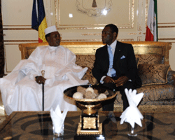 Un an après Mongomo, où il a assisté aux côtés de son frère et ami Théodoro Obiang Nguema Mbasogo, à la cérémonie marquant le 44ème anniversaire de l’accession de la Guinée Equatoriale à la souveraineté internationale, le Chef de l’État IDRISS DEBY ITNO, retourne en terre équato-guinéenne, pour participer cette fois-ci, aux festivités marquant le 45ème anniversaire de l’indépendance de la République équato-guinéenne. IDRISS DEBY ITNO est accueilli personnellement au bas de la passerelle à l’aéroport international de Malabo par son homologue, Théodoro Obiang Nguema Mbasogo. Le Président de la République et la délégation qui l’accompagne ont ensuite eu droit à tous les honneurs dus à leurs rangs. Après l’exécution de l’hymne de la CEMAC, IDRISS DEBY ITNO et son homologue équato-guinéen ont passé en revue les troupes, avant de saluer les corps constitués. Ces officiels du pays hôte avaient à leurs côtés pour la circonstance l’ambassadeur du Tchad en Guinée Equatoriale, Ngaryanan Djagué Nahari. Le rituel protocolaire fini, les deux Chefs d’État se retirent au salon d’honneur, où ils ont eu une longue discussion. Les questions sécuritaires, économiques et politiques liant les deux pays ont été abordées. L’entretien terminé, une autre surprise attend le Chef de l’État au sortir du salon d’honneur : la colonie tchadienne vivant en terre équato-guinéenne a également tenu à réserver un accueil chaleureux à son Président. Outre les festivités marquant le 45ème anniversaire de l’accession de la Guinée Equatoriale à la souveraineté internationale, le séjour du Chef de l’État à Malabo prévoit bien d’autres activités, notamment des rencontres avec certains de ses pairs et d’autres personnalités.