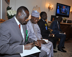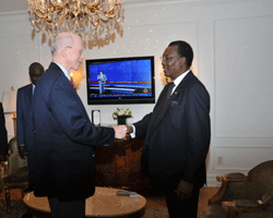 Après 18 ans à la tête de léOrganisation des Nations Unies pour léAlimentation et léAgriculture, Jacques Diouf passera le témoin à son successeur en janvier 2012. Mais avant son départ, le Directeur Général de la FAO a tenu à faire le point avec le Président de la République IDRISS DEBY ITNO sur la campagne agricole actuelle. Pour Jacques Diouf, le Tchad dispose déénormes potentialités quéil faut mettre en valeur afin déarriver à une autosuffisance alimentaire. Pour ce faire, les Tchadiens doivent se mettre résolument au travail. En consacrant les trois premières années de son mandat au monde rural, le Président de la République IDRISS DEBY ITNO trace la voie à suivre, et le patron de la FAO de se féliciter de cette volonté clairement affichée des plus hautes autorités de promouvoir le secteur rural. La deuxième audience a porté sur la crise du Darfour. Pour en parler, le Chef de léÉtat a reçu léenvoyé spécial du Président américain pour le Darfour, léambassadeur Smith. Ce dernier estime que le Darfour reste un sujet déactualité. Il séest dit totalement optimiste quant à la résolution de ce conflit. La médiation du Qatar et les conseils avisés du Président tchadien sont de nature, à accélérer le processus de réconciliation des frères soudanais et déun retour à la paix définitive a souligné léambassadeur Smith. Pour être plus complet, le Chef de léÉtat a reçu les reporters de léagence de presse new-yorkaise lundi en fin déaprès-midi. Plusieurs questions lui ont été posées par les journalistes de City Press : léavenir de la Libye nouvelle, la chute de Kadhafi, le sort des Tchadiens en Libye, ainsi que des sujets de politique nationale. Si le Président de la République IDRISS DEBY ITNO reconnait la chute de Mouammar Kadhafi, il a demandé au CNT déassurer la sécurité des Tchadiens encore présents en Libye. « LéAfrique a un rôle à jouer dans la construction de la Libye nouvelle et elle ne doit pas être exclue par la communauté internationale », a-t-il indiqué. Au cours de cette interview, IDRISS DEBY ITNO a rejeté ces clichés collés à notre pays. Il néya pas de prisonniers politiques ni déopinion. Le Tchad est un pays démocratique qui a certes connu la guerre, mais qui avance. Le Président a invité les reporters américains à venir au Tchad pour se faire une idée exacte de la situation actuelle et des progrès enregistrés depuis deux décennies.
