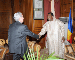 Léambassadeur itinérant pour la sauvegarde du Lac Tchad Dr Emile Mallet, accompagné du ministre de léEnvironnement Hassan Terap, a été reçu pendant deux quart déheures par le Président de la République IDRISS DEBY ITNO. Le Chef de léÉtat a mandaté Emile Mallet pour une mission de plaidoyer auprès des pays amis et autres partenaires au développement afin quéils participent pleinement à la sauvegarde du Lac Tchad. Léambassadeur itinérant est venu rendre compte au Chef de léÉtat IDRISS DEBY ITNO de ses activités et recevoir auprès de lui, des nouvelles orientations.