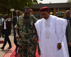 Le Président de la République IDRISS DEBY ITNO est le premier dirigeant africain à séêtre rendu au Niger où sont stationnées les forces des pays devant participer à la Mission internationale de soutien au Mali (MISMA). Celles-ci vont franchir dans quelques heures la frontière malienne et se rendre directement à Gao. Le chef suprême des armées tchadiennes est allé remonter le moral de ses troupes, mais aussi leur donner des instructions. Cette rencontre a eu pour cadre le camp de la Gendarmerie du Niger. Le Président de la République IDRISS DEBY ITNO leur a indiqué quéils ont une mission bien précise à remplir : celle de participer à la libération du Mali dont une grande partie du pays a été occupée pendant neuf mois par des terroristes et des narcotrafiquants. Pour le chef suprême des armées tchadiennes, le combat auquel vont participer les forces armées et de sécurité néest rien déautre quéun combat pour la liberté et la démocratie. Les troupes tchadiennes sont conscientes de leur mission et des attentes de toute léAfrique pour leur professionnalisme et leurs grandes qualités sur le terrain. Vous devez, a rappelé le chef de léÉtat, contribuer au rétablissement de léintégrité territoriale du Mali. « Moral haut ! Moral haut ! », ont scandé les soldats tchadiens dont la détermination se lisait sur chaque visage. Arrivé à Niamey dans la matinée, le Président de la République IDRISS DEBY ITNO séest entretenu avec son homologue nigérien, Mahamadou Issoufou au salon déhonneur de léaéroport international Diori Hamani, entretien axé sur la coopération bilatérale et léopération « Serval », actuellement en cours au Mali. Cette opération lancée par la France a obtenu le soutien de plusieurs pays africains dont le Tchad et le Niger, ce dernier ayant annoncé léenvoi de 500 hommes. Rappelons que conformément à la résolution 2085 du 20 décembre 2012 du Conseil de Sécurité des Nations Unies autorisant le déploiement de la Mission Internationale de Soutien au Mali (MISMA), ainsi quéaux appels de léUnion Africaine et à la demande expresse en date du 14 Janvier 2013 du président de la République du Mali, le Tchad a décidé déenvoyer le 16 janvier dernier un contingent de 2.000 hommes au Mali.