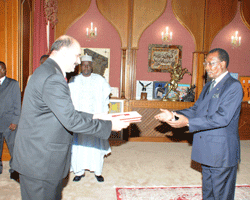 La cinquantaine révolue, léambassadeur extraordinaire et plénipotentiaire de la République déAfrique du Sud Dayanand Naidoo pose pour la première fois ses valises au Tchad. Diplomate chevronné, il a servi son pays successivement en Inde et à léIle Maurice, puis a été nommé Directeur général du Protocole au ministère des affaires étrangères. En présentant ce jeudi ses lettres de créance léaccréditant auprès du Chef de léÉtat IDRISS DEBY ITNO, le diplomate sud africain entend contribuer au renforcement des liens déamitié et de coopération qui existent entre son pays et le Tchad. NéDjaména et Pretoria entretiennent, en effet, de très bonnes relations marquées par des contacts de très haut niveau entre les deux Chefs déÉtat IDRISS DEBY ITNO et Jacob Zuma. Enseignant, spécialisé en histoire contemporaine africaine, Dr Ahmat Kavas a partagé ses connaissances dans plusieurs universités turques. Il a été Conseiller spécial du premier ministre turc, son dernier poste, avant déêtre nommé ambassadeur de son pays au Tchad. En présentation ses lettres de créance léaccréditant auprès du Chef de léÉtat, le diplomate turc et le Président de la République IDRISS DEBY ITNO ont fait le tour déhorizon des questions touchant la coopération bilatérale liant les deux peuples, coopération quéils entendent renforcer. Le nouvel ambassadeur turc a promis fluidifier léaxe NéDjaména-Ankara pour léintérêt des peuples turc et tchadien. Plusieurs domaines de coopération seront, à cet effet, explorés dont la desserte de la capitale NéDjaména dès le mois de juin prochain par la compagnie turkish Airlines. Ces cérémonies de présentation de lettres de créance se sont déroulées en présence du ministre des Affaires étrangères et de léintégration africaine, M. Moussa Faki Mahamat et de quelques proches collaborateurs du Chef de léÉtat.