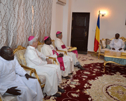 Près dun mois après le décès de lArchevêque de NDjamena, Mgr Mathias Ngartéri Mayadi, le Chef de lÉtat IDRISS DEBY ITNO a reçu ce lundi, les membres de la Conférence épiscopale du Tchad, sous la conduite de son président, Mgr Jean Claude Bouchard, évêque de Pala. Ils sont venus exprimer toute leur gratitude au Chef de lÉtat, pour sa grande marque de compassion exprimée lors de cette dure épreuve, qua traversée léglise catholique. Au cours de cette audience, les membres de la Conférence épiscopale ont saisi lopportunité pour échanger avec le Chef de lÉtat, sur nombre de projets quils entendent réaliser. Le dialogue interreligieux et la cohabitation pacifique, voilà deux sujets qui tiennent à cur le Chef de lÉtat IDRISS DEBY ITNO. Le Président de la République a exhorté les hommes de Dieu à faire de telle sorte que la bonne cohabitation entre les différentes confessions religieuses demeure une constante. A ce sujet, le président de la Conférence épiscopale se veut très rassurant. « Mathias est parti, mais ceux qui restent doivent prendre sa succession et travailler dans ce sens», a conclu le président de la Conférence épiscopale, Jean Claude Bouchard à lissue de laudience présidentielle.