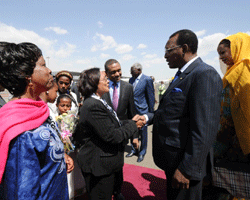 Le Président de la République IDRISS DEBY ITNO et la Première Dame HINDA DEBY ITNO foulent à nouveau le sol éthiopien, six mois après avoir pris part respectivement aux travaux du 19ème Sommet des Chefs déÉtat de léUnion africaine et la rencontre des Premières Dames déAfrique consacrée à la Transmission du VIH/SIDA de la mère à léenfant. A léaéroport international Bolé déAddis-Abeba, le Chef de léÉtat IDRISS DEBY ITNO est accueilli à sa descente déavion par la ministre Ethiopienne des Mines, Mme Sinkinesh EJIGU qui avait à ses côtés une représentante de la Commission de léUnion africaine et léambassadeur du Tchad près la République fédérale démocratique déEthiopie, M. Chérif Mahamat Zène. Le Chef de léÉtat a ensuite eu droit à tous les honneurs dus à son rang. La petite colonie tchadienne déAddis-Abeba composée en majorité des fonctionnaires internationaux, étudiants et personnel diplomatique a tenu à faire le déplacement de léaéroport pour réserver un accueil chaleureux à son Président et à la Première Dame du Tchad. La symbiose entre le couple présidentiel et la colonie tchadienne déAddis-Abeba se passe de tout commentaire. Léharmonie est parfaite et léapothéose est inaltérable comme en témoignent ces images. Finie cette étape protocolaire, le Chef de léÉtat et la délégation qui léaccompagne ont mis le cap sur la chancellerie du Tchad. Ce dimanche 27 janvier le Chef de léÉtat assistera à léouverture officielle des travaux du 20ème Sommet de léUnion africaine placé sous le thème « Panafricanisme et Renaissance Africaine ». La Première Dame HINDA DEBY ITNO participera pour sa part à une rencontre de haut niveau sur la Campagne pour léaccélération de la réduction de la mortalité maternelle en Afrique (CARMMA).