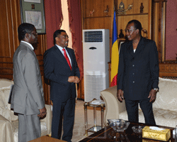 Après avoir pris officiellement fonction le 02 mars 2012, le nouveau secrétaire général de la Communauté Economique des États de léAfrique Centrale (CEEAC) Nassour Guelendouksia Ouaïdou est venu recueillir les avis, conseils et suggestions du Président en exercice de la CEEAC, IDRISS DEBY ITNO pour lui permettre déaccomplir sa mission. Pendant plus déune heure, les deux tchadiens chargés de mener à bien la baraque CEEAC ont planché sur le devenir de léinstitution et les voies et moyens déinciter les États membres à verser leurs arriérés de cotisation. Des instructions ont été données au Secrétaire général de la Communauté Economique des États de léAfrique Centrale (CEEAC), Nassour Guelendouksia Ouaïdou pour entamer une tournée de sensibilisation dans les États membres à léeffet de les encourager à honorer leurs engagements. Après le Secrétaire général de la Communauté Economique des États de léAfrique Centrale (CEEAC), le Chef de léÉtat, prévoit une rencontre avec le Directeur Général de léOrganisation africaine de la propriété intellectuelle (OAPI). Le gabonais, Dr Paulin Edou Edou accompagné de notre compatriote Mbaïoundakom Nassiyo Laoubara sont reçus pendant trois quart déheure. La bonne santé économique de léinstitution et ses perspectives sont les principaux points abordés au cours des discussions. Le DG de léOAPI est venu recueillir la signature du Chef de léÉtat IDRISS DEBY ITNO, sur la déclaration de Dakar, relative à la promotion de léinvention et léinnovation en Afrique.