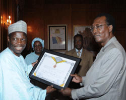 Après quatre années de mission diplomatique au Tchad, léAmbassadeur extraordinaire et plénipotentiaire de la République Fédérale du Nigéria auprès de la République du Tchad, Abdullahi Azukutenyi Omaki est arrivé au terme de sa mission. Accompagné de son épouse, le diplomate nigérian est venu au palais présidentiel remercier le Chef de léÉtat pour sa disponibilité. Tout au long de son séjour au pays de Toumaï, Abdullahi Azukutenyi Omaki a contribué à renforcer léaxe NéDjaména-Abuja. Céest pourquoi, le Chef de léÉtat IDRISSS DEBY ITNO a tenu à léélever au rang déofficier de léordre national du Tchad. En faisant ses adieux au Président de la République, le diplomate nigérian a tenu à lui exprimer toute sa reconnaissance pour le soutien dont il a bénéficié durant sa mission au Tchad. La coopération bilatérale liant NéDjaména et Abuja se porte très bien, et cela se justifie par les multiples contacts entre le Président de la République IDRISS DEBY ITNO et son homologue Goodluck Ebélé Jonathan.
