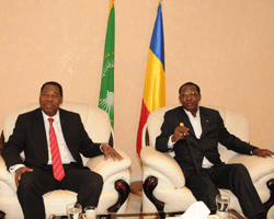 Cest au bas de la passerelle que le Président de la République IDRISS DEBY ITNO a accueilli, ce samedi 14 septembre 2013, en fin daprès-midi, son frère et ami, Yayi Boni. Le Chef de lÉtat tchadien avait à ses côtés, le Premier ministre Joseph Djimrangar Dadnadji, quelques membres du gouvernement, son directeur de cabinet civil, son chef dÉtat-major particulier et le maire 1er adjoint de la ville de NDjaména. Interrogé par la presse nationale, le Chef de lÉtat béninois a déclaré quil est venu échanger avec le Président de la République IDRISS DEBY ITNO sur les grandes préoccupations de lAfrique et recueillir, en retour, ses sages conseils. Autre sujet inscrit à lordre du jour de cette visite : ladhésion du Tchad à l'Union économique et monétaire ouest-africaine (UEMOA). Le Président Yayi Boni a, par ailleurs, exprimé son inquiétude face aux foyers de crises qui secouent la sous-région.