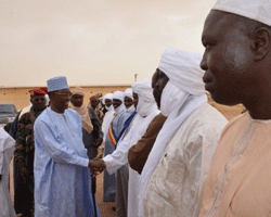 Logé dans le Tchad-profond à 1.300 km au Nord-est de NéDjaména, Am-Djarass, chef-lieu de la région de léEnnedi Est, cette ville qui a vu naître le Président de la République IDRISS DEBY ITNO peu avant léindépendance du Tchad, léaccueille à nouveau pour ses vacances . Céest devenu presquéune tradition pour le Chef de léÉtat IDRISS DEBY ITNO déentamer le mois sacré du ramadan parmi les siens. Ce vendredi 05 juillet 2013, à léaérodrome déAm-Djarass, céest un comité très restreint qui a réservé un accueil chaleureux au Président de la République. Il est composé des autorités administratives, traditionnelles et des chefs militaires de la région. Cette énième descente du Chef de léÉtat à Am-Djarass, terre de ses aïeux, laisse présager son attachement à sa ville natale. Céest le gouverneur de la région de léEnnedi Est, le Général Hassan Djorobo qui a accueilli le Chef de léÉtat au pied de léavion. Il avait à ses côtés pour la circonstance, le commandant de la zone de défense n°8, le général de Brigade Mahamat Bilal, le sultan du Dar-Bilia, Salim Youssouf Itno, le Maire de la ville et les députés de la région. Le Président de la République serre ensuite les mains des officiels et tous ceux qui ont pu accéder à la piste déatterrissage pour lui témoigner leur soutien et leur adhésion massive à la Renaissance du Tchad, lancée officiellement, un 1er décembre 2010 à Ati, dans le chef-lieu de la région du Batha.