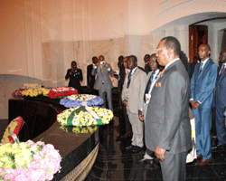 Si aujourdhui lAngola est mis sur les rails du développement par lactuel Président José Eduardo Dos Santos et cité parmi les premiers pays africains producteurs de lor noir, force est de reconnaître quil y a un homme, qui aux premières heures des indépendances a consacré toute sa vie et son énergie à la lutte de libération et de conquête de lindépendance dAngola, jai nommé António Agostinho Neto, premier Président de la République angolaise. Médecin de son État, C'était Agostinho Neto, qui proclama lindépendance de son pays, le11 novembre 1975. Malade, Neto est mort en exercice à Moscou, le 10 septembre 1979 et sera remplacé à la tête du pays par José Eduardo Dos Santos, l'actuel chef de l'État. Cest pour saluer et honorer la mémoire de ce grand homme dÉtat que le Président de la République IDRISS DEBY ITNO est allé ce mardi, déposer une gerbe de fleurs au pied du mémorial érigé à la Place de lindépendance de Luanda à la mémoire du Premier Président angolais héros de lindépendance. Le Chef de lÉtat IDRISS DEBY ITNO sest incliné ensuite au pied du mémorial. Il voulait, à travers ce geste symbolique, immortalisé tous ceux qui se sont sacrifiés pour la défense de la patrie angolaise et des institutions républicaines. Latmosphère était pesante. Le Premier moment chargé démotion est celui du recueillement du Chef de lÉtat face au mémorial. Lautre moment fort est celui pendant lequel lon voit le Président de la République assis entrain de signer le livre dor. IDRISS DEBY ITNO a écrit de sa plus belle plume, son message de sympathie en ces termes : « « cest un grand honneur et un privilège de visiter le mémorial dun grand combattant pour la liberté et lindépendance de son pays. Je mincline devant sa mémoire avec respect et honneur. Que son uvre se perpétue de génération en génération », fin de citation. Cest après ces mots dadieu très chargés dun Président de la République en exercice à celui qui nest plus de ce monde que le Chef de lÉtat IDRISS DEBY ITNO a quitté les lieux, direction : le siège de lAssemblée nationale angolaise.